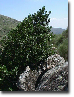 Pode ter 10 metros de alto. As follas son verdes todo o ano, son duras, brilantes e pican, claro que pican. Cando florece o fruto é unha bola ( ve-la foto).