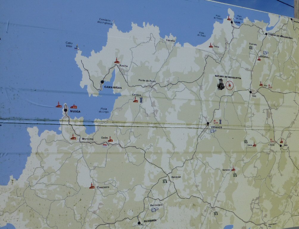 Situación dos batáns de Mosquetín preto de Vimianzo e un pouco antes de Baio. O río que pasa pola zona é o río Grande.
