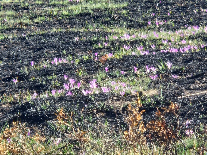 Esta fotografía é moi curiosa e demostra a resiliencia da natureza. Oito días foron suficientes para que aparezca a quitamerendas, que non é máis que a Merendera montana, falso azafrán ou azafrán silvestre. O nome popular venlle de que a súa aparición marca a época na que o día empeza a devalar, a principio do outono, ou sexa os días son máis pequenos, e polo tanto os xornaleiros non lle servían a merenda no campo os traballadores e xa tiñan que irse a casa. No Courel chámanlle Tollemerendas. No resto de España recibe nomes moi curiosos como robameriendas, espantapastores, nomeriendes, robameriendas, flor de otoño, etc.