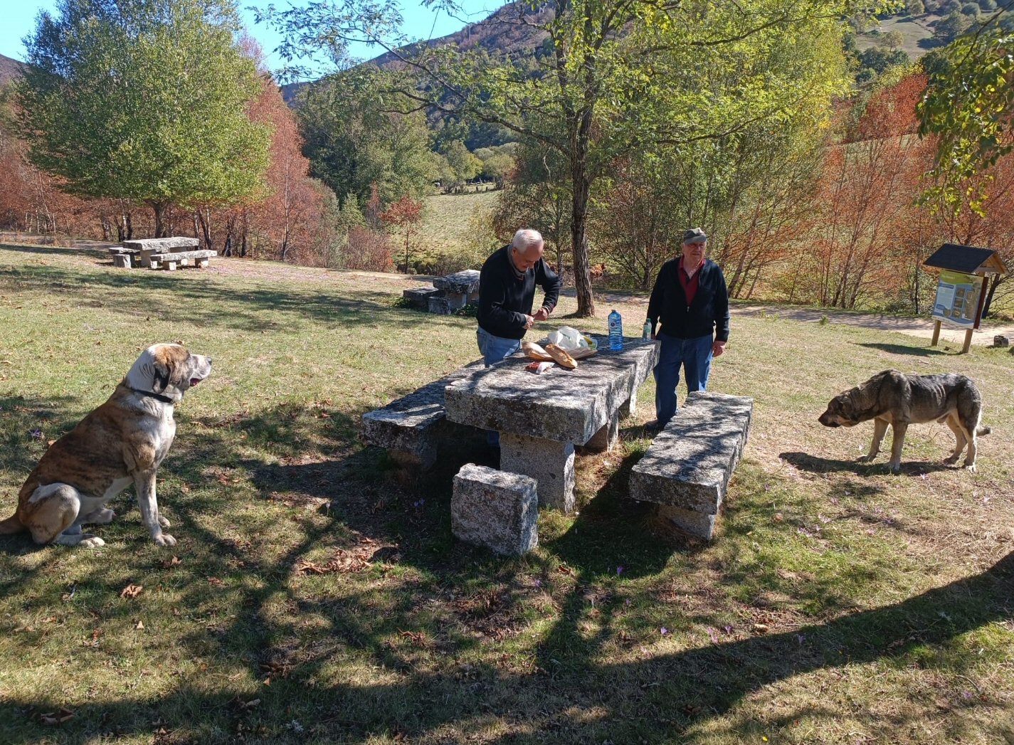 Por certo os cans que aparecen son os mastíns do Sr. Enrique que xa había baixado coas vacas ata o río e as levaba a un prado que non ardeu. Os mastíns deberon cheirar os chourizos e o pan e estuveron atentos por si caía algo. O Border Collie o seu, co seu dono e levando as vacas o seu lugar.