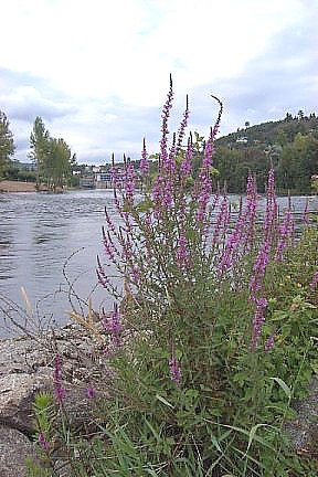Salgueiriños no río Miño , preto do encoro de Velle. Ourense. O Salgueiriño é unha pranta que pode chegar os 2 metros, coas súas flores en espigas violáceas, moi bonitas.