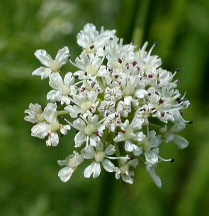 A cicuta , Conium maculatum tamén se atopa nos prados.