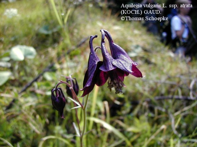 Flores inclinadas, violeta, rosa ou blancas, de 3-5 cms. de longas, incluidos 5 espolóns de 15-22 cms, moi ganchudos. Carpelos glandulo-pelosos.