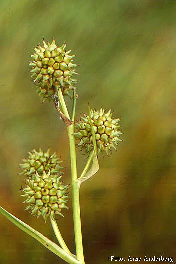 Xeralmente atópase nos ríos en augas pouco profundas, con talos erectos, a inflorescencia é típica e componse, como se pode ver na fotografía , de moitas cebezuelas de flores verdosas e amarelas.