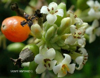 Flores nacen no cumio das pólas, nun acio. Son pequenas , coa corola blanca e catro lóbulos terminais patentes. Flores en acio blancas.