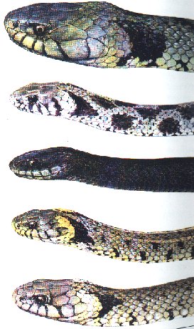 As distintas libreas da Natrix natrix pode verse neste dibuxo.