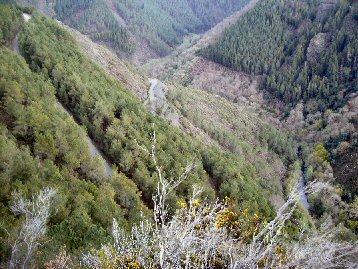 Baixando o refuxio. Observar a curva... Bosque de ribeira incrible. Hai de todo dende amieiros, castaños, etc. Por detrás pinos... O río Lor na zona, con bastante máis auga.