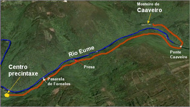 No dibuxo plantexo a primeira ruta entre o Centro de Precintaxe e o Mosteiro de Caaveiro. Total ida e volta 6 kms.