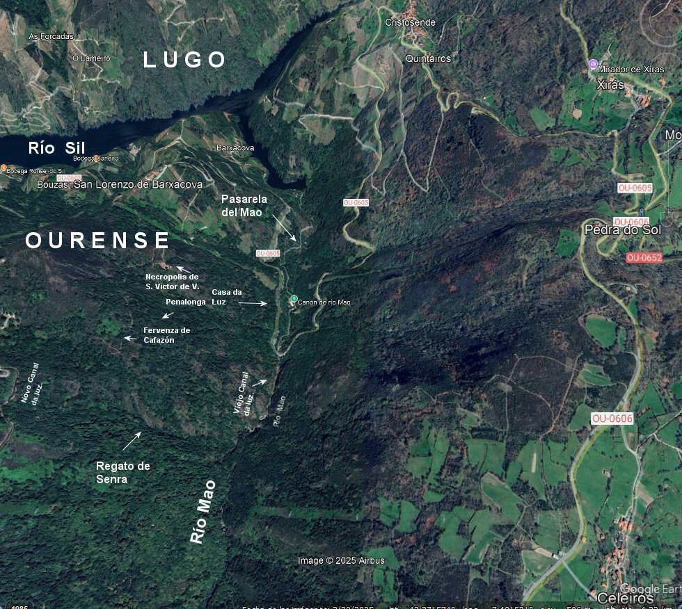 Nesta imaxen sacada de Google Earth pode darse unha idea de como é o Canón do río Mao na súa desembocadura. Unha mágoa que non se note o efecto 3D que se ve noutras pantallas.