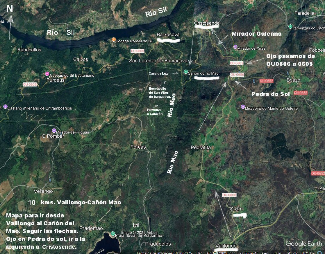 A ruta para ir de Valilongo ao Cañón do río Mao é doada mirando o mapa. Ao sair de Valilongo á esquerda a 50 m. esta a carretera, ver a flecha. Collemos a estrada OU-0606 por Sistín. A 5 km. tendes a Pedra do Sol e ao pasala, aparece un cruce que hai que coller a esquerda, pón Cristosende: