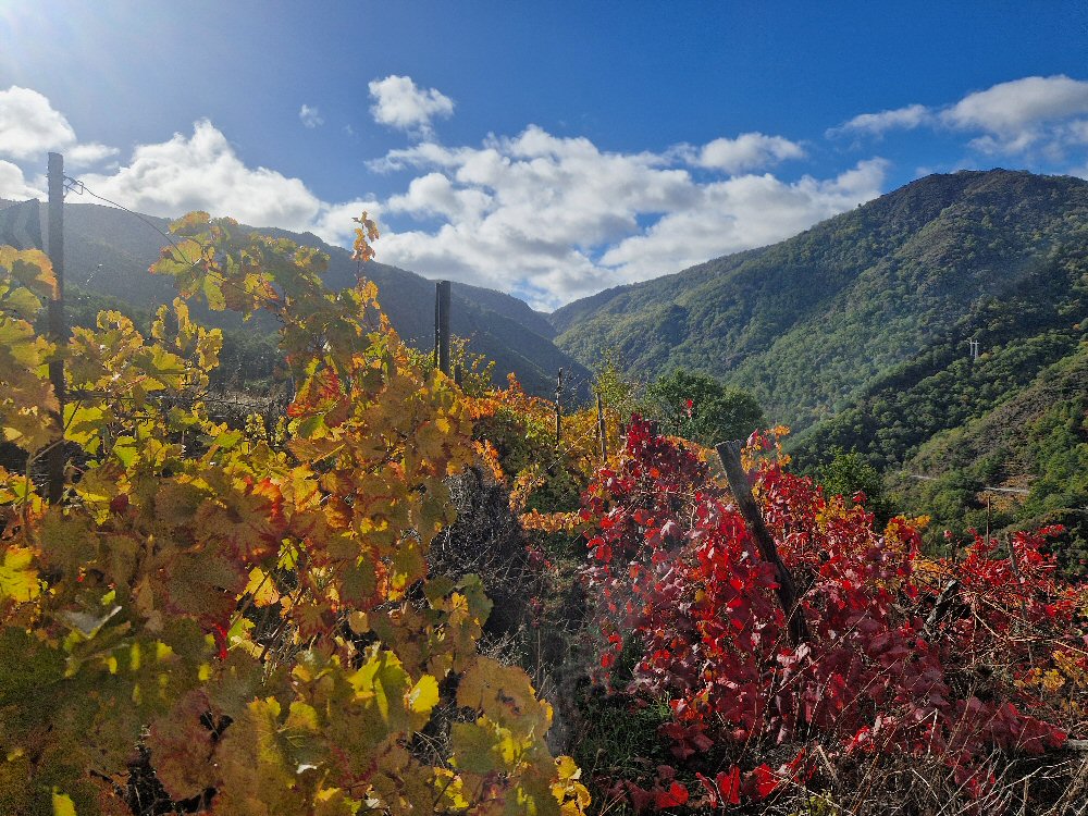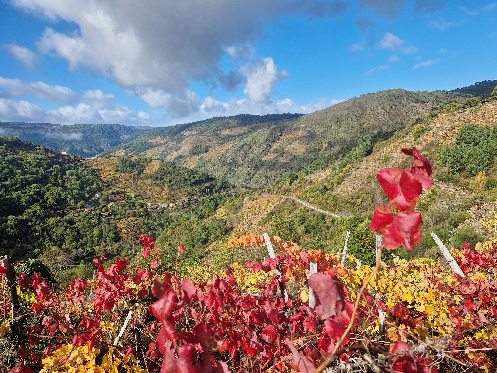 Logo, na baixada ao Canón do Mao, paramos para ver os socalcos de esa parte; estamos a principios do mes de novembro, concretamente o día 08/11/25 e as viñas comenzan a ter esos cores que namoran. Na fotografía o canón do río Mao na súa desembocadura, co pueblo de Barxacova.