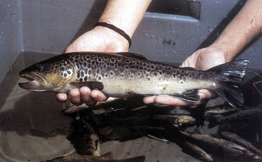 Esta é unha troita común, de tódolos xeitos teñoas collido moito máis bonitas. Esta paréceme de piscifactoría, eso si, común, pero non me gustan as aletas, non sei que lles vexo. A fotografía dende logo é boa que é o que interesa.