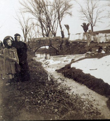 Lavandeiras a dereita e roupa a secar extendida no prado que hai á beira do río... Río dos Caralliños en Compostela. Descoñezo ao autor da fotografía