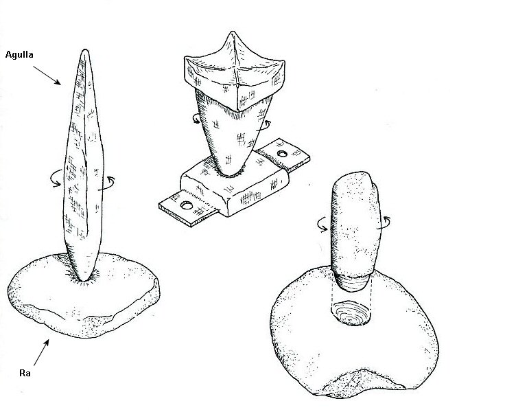 Estas son as pezas de sustención do xiro do eixo na parte de abaixo a agulla (aguillón en Camba Grilo noutros lugares) é a parte de arriba ou sexa o eixo e a ra (porca en Camba) é a de abaixo, poden ser de ferreiro ou de pedra. Aquí hai tres exemplos unha a da esquerda leva a ra de pedra e a agulla de ferreiro. A do medio é toda de ferreiro e a da dereita son de pedra as dúas.