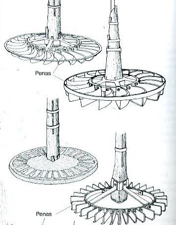 Neste dibuxo vense algúns dos rodicios empleados nos muíños de Pontevedra. As penas son as penlas en Camba. Hai quen lles chama culleres (Eligio Rivas).